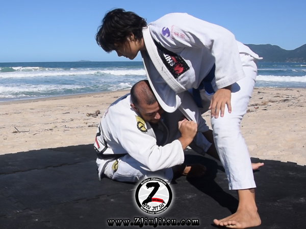 Como demonstro no vídeo, quando afasto a adversária com minha perna direita e subo, faço uma pegada na manga direita dela e logo passo seu braço pelo meio de suas pernas e entrego para a outra mão. Neste momento, me ajeito para tentar realizar a raspagem, mas a adversária dificulta o movimento pesando o joelho em direção ao meu peito.